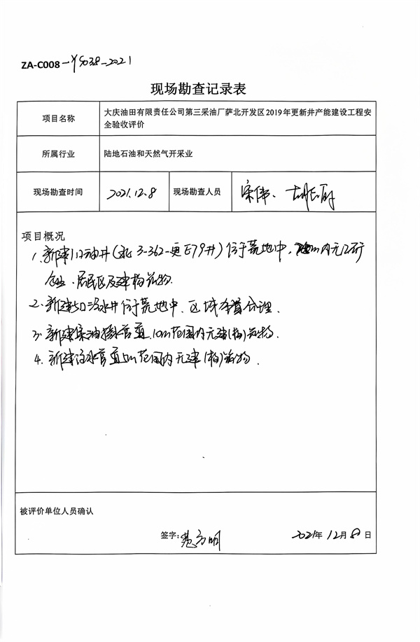大慶油田有限責(zé)任公司第三采油廠薩北開發(fā)區(qū)2019年更新井產(chǎn)能建設(shè)工程安全驗(yàn)收評(píng)價(jià)報(bào)告 |