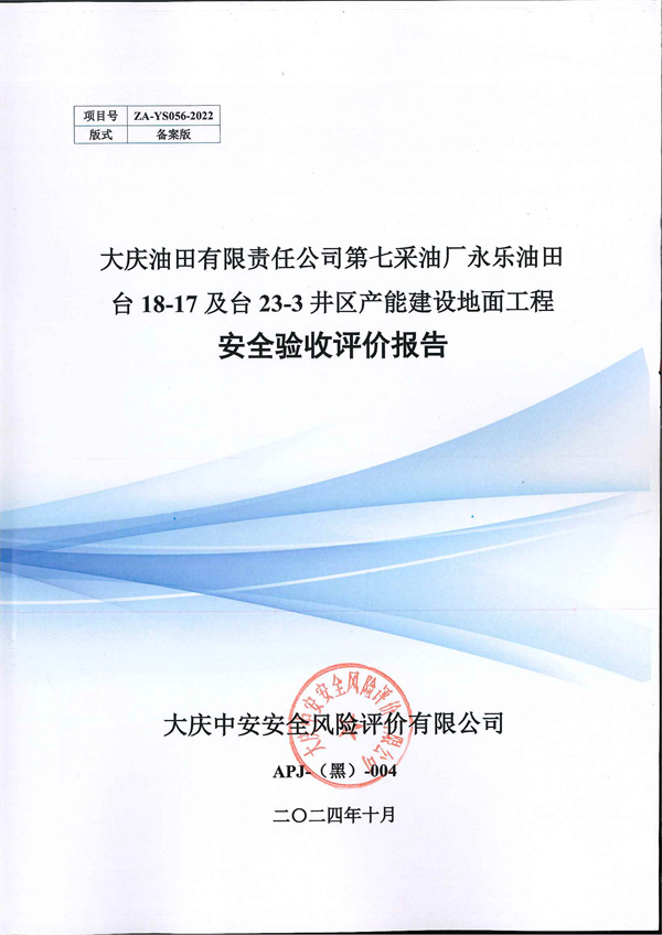 大慶油田有限責(zé)任公司第七采油廠永樂油田臺18-17及臺23-3井區(qū) 產(chǎn)能建設(shè)地面工程安全驗收評價報告