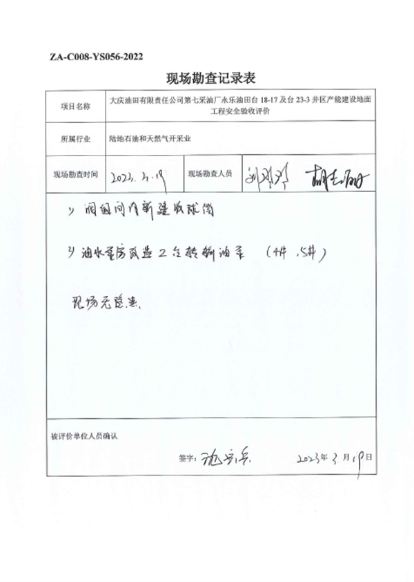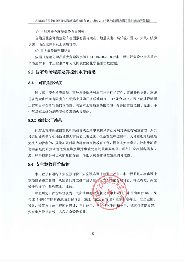 大慶油田有限責(zé)任公司第七采油廠永樂油田臺18-17及臺23-3井區(qū)產(chǎn)能建設(shè)地面工程設(shè)計、施工、試運行管理和監(jiān)督制度齊全,安全設(shè)施、設(shè)備、裝置與主體工程同時設(shè)計、同時施工、同時投入生產(chǎn)和使用,試運行情況良好,安全生產(chǎn)管理有效,具備安全驗收條件。 |