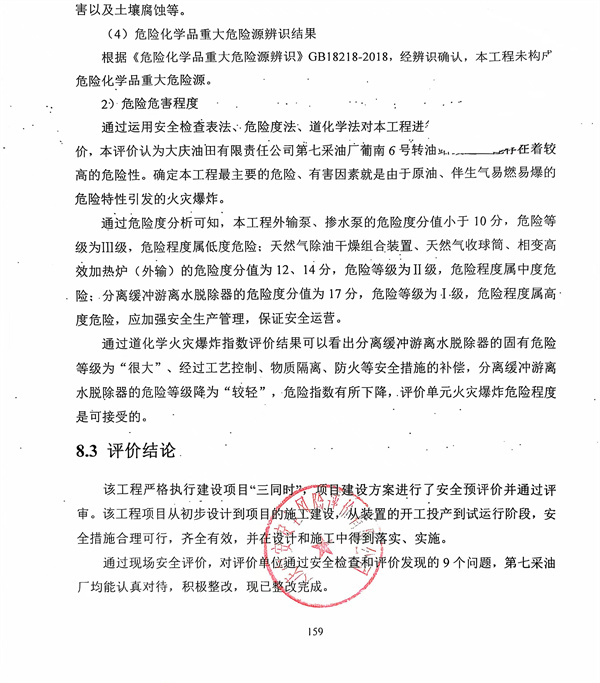 該工程嚴格執(zhí)行建設(shè)項目“三同時”,項目建設(shè)方案進行了安全預(yù)評價并通過評審。該工程項目從初步設(shè)計到項目的施工建設(shè),從裝置的開工投產(chǎn)到試運行階段,安全措施合理可行,齊全有效,并在設(shè)計和施工中得到落實、實施。 通過現(xiàn)場安全評價,對評價單位通過安全檢查和評價發(fā)現(xiàn)的9個問題,第七采油廠均能認真對待,積極整改,現(xiàn)已整改完成。 結(jié)論:大慶油田有限責任公司第七采油廠葡南6號轉(zhuǎn)油站改造工程安全設(shè)施符合“三同時”要求,試運行情況良好,安全生產(chǎn)管理有效,具備安全驗收的條件。 |