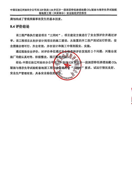 中國石油遼河油田分公司雙229塊洼128井區(qū)沙一段深層特低滲透油藏CO2驅(qū)油與埋存先導(dǎo)試驗(yàn)配套地面工程(興采部分)安全驗(yàn)收評價(jià)報(bào)告 |