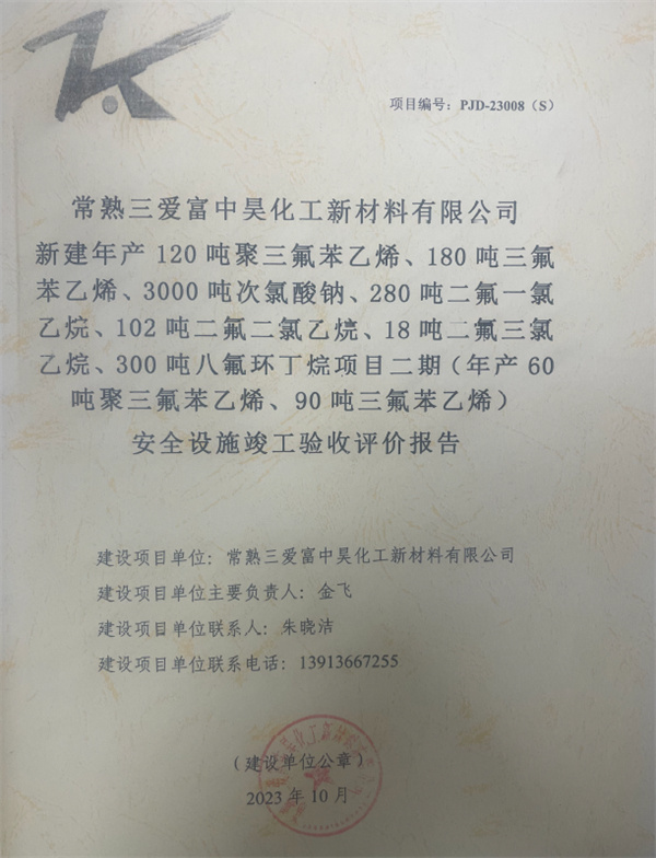 常熟三愛富中昊化工新材料有限公司新建年產(chǎn)120噸聚三氟苯乙烯、180噸三氟苯乙烯、3000噸次氯酸鈉、280噸二氟一氯乙烷、102噸二氟二氯乙烷、18噸二氟三氯乙烷、300噸八氟環(huán)丁烷項(xiàng)目二期(年產(chǎn)60噸聚三氟苯乙烯、90噸三氟苯乙烯)安全設(shè)施竣工驗(yàn)收評價(jià)報(bào)告