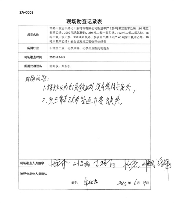 常熟三愛富中昊化工新材料有限公司新建年產(chǎn)120噸聚三氟苯乙烯、180噸三氟苯乙烯、3000噸次氯酸鈉、280噸二氟一氯乙烷、102噸二氟二氯乙烷、18噸二氟三氯乙烷、300噸八氟環(huán)丁烷項(xiàng)目二期(年產(chǎn)60噸聚三氟苯乙烯、90噸三氟苯乙烯)安全設(shè)施符合設(shè)計(jì)要求,具備安全設(shè)施竣工驗(yàn)收條件。 |