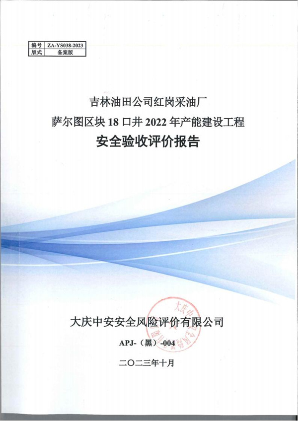 吉林油田公司紅崗采油廠薩爾圖區(qū)塊18口井2022年產(chǎn)能建設(shè)工程安全驗收評價 |
