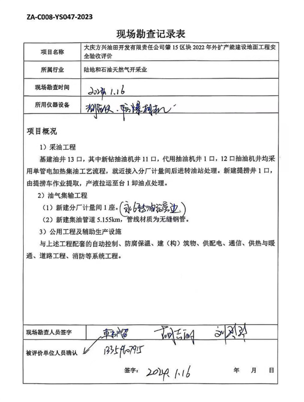 大慶油田有限責(zé)任公司方興分公司肇15區(qū)塊2022年外擴(kuò)產(chǎn)能建設(shè)地面工程安全驗(yàn)收評(píng)價(jià)