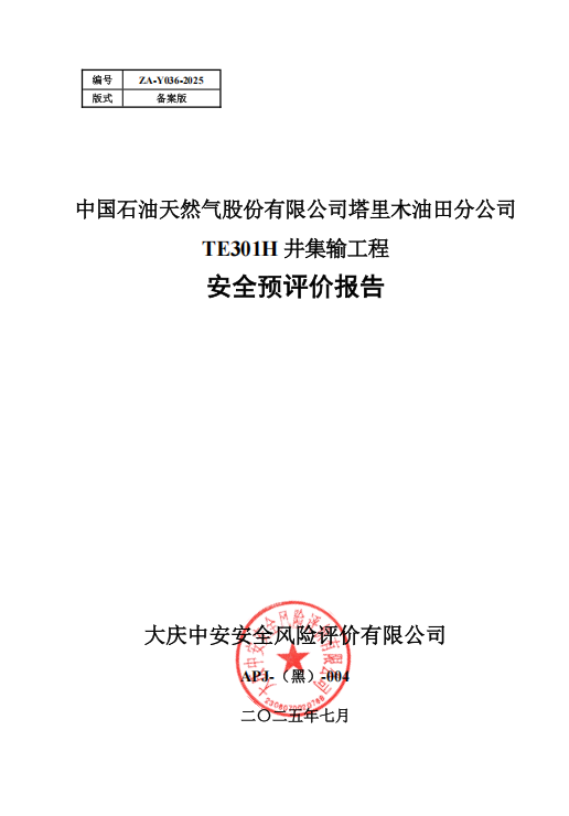 中國石油天然氣股份有限公司塔里木油田分公司TE301H井集輸工程安全預評價報告