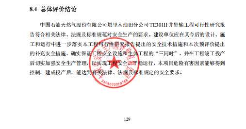 中國石油天然氣股份有限公司塔里木油田分公司TE301H井集輸工程可行性研究報告符合相關法律、法規(guī)及標準規(guī)范對安全生產(chǎn)的要求。建設單位應在其今后的設計、施工和運行中進一步落實本工程可行性研究報告提出的安全技術措施和本次預評價提出的補充安全措施,確實保證工程安全設施和主體工程的“三同時”,并在工程竣工投產(chǎn)后切實加強安全生產(chǎn)管理,以實現(xiàn)工程安全、平穩(wěn)運行,本項目危險有害因素能夠得到控制,建成投產(chǎn)后,能達到有關法律、法規(guī)及標準規(guī)定的安全要求。 |