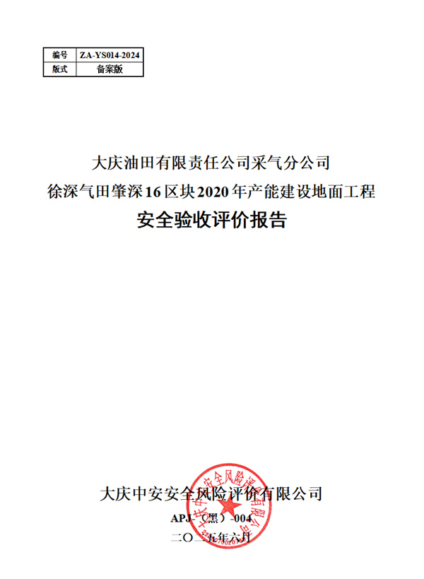 大慶油田有限責任公司采氣分公司徐深氣田肇深16區(qū)塊2020年產(chǎn)能建設(shè)地面工程 安全驗收評價
