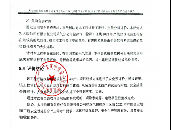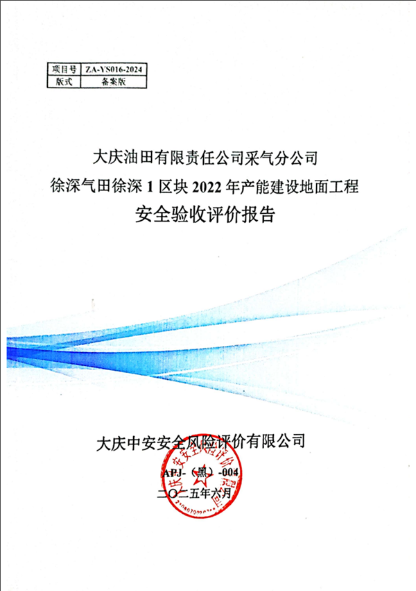 大慶油田有限責(zé)任公司采氣分公司徐深氣田徐深1區(qū)塊2022年產(chǎn)能建設(shè)地面工程 安全驗收評價報告