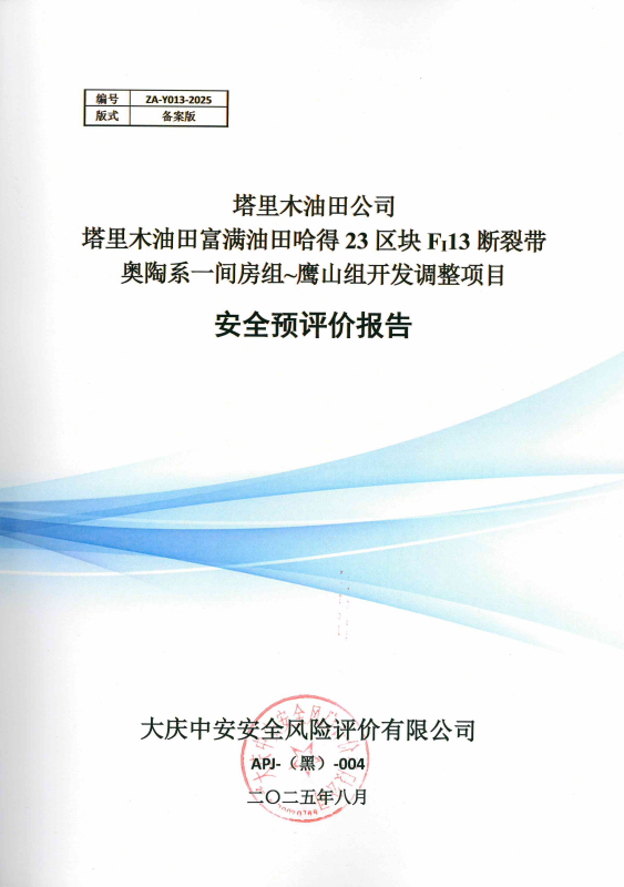 塔里木油田公司塔里木油田富滿油田哈得23區(qū)塊FI13斷裂帶奧陶系一間房組~鷹山組開發(fā)調(diào)整項(xiàng)目安全預(yù)評(píng)價(jià)報(bào)告