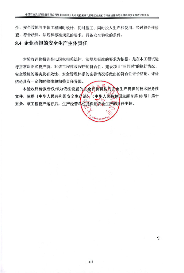 中國石油天然氣股份有限公司塔里木油田分公司克拉采油氣管理區(qū)危廢貯存環(huán)保設(shè)施隱患治理項目設(shè)計、施工、試運行管理和監(jiān)督制度齊全,安全設(shè)施與主體工程同時設(shè)計、同時施工、同時投入生產(chǎn)和使用,經(jīng)過符合性檢查,符合法律、法規(guī)和標(biāo)準(zhǔn)規(guī)范的要求,具備安全驗收的條件。 |