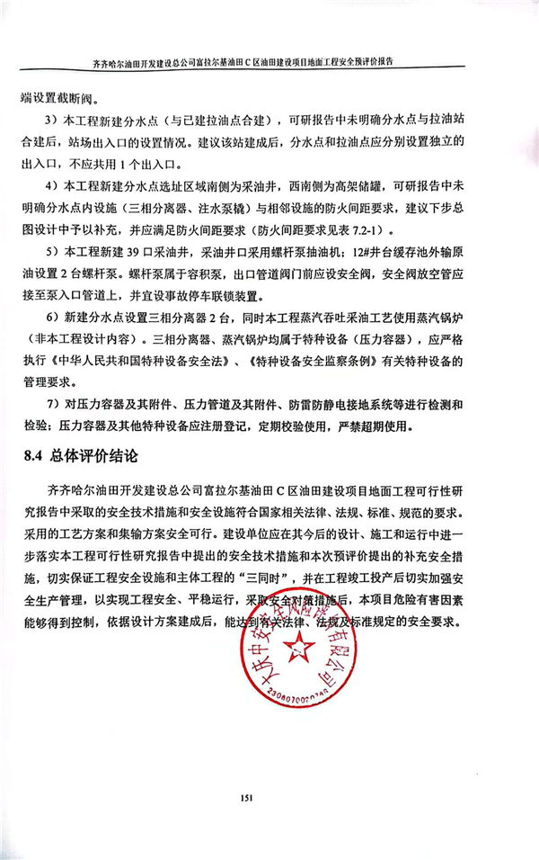 齊齊哈爾油田開發(fā)建設(shè)總公司富拉爾基油田C區(qū)油田建設(shè)項(xiàng)目地面工程可行性研究報(bào)告中采取的安全技術(shù)措施和安全設(shè)施符合國家相關(guān)法律、法規(guī)、標(biāo)準(zhǔn)、規(guī)范的要求。采用的工藝方案和集輸方案安全可行。建設(shè)單位應(yīng)在其今后的設(shè)計(jì)、施工和運(yùn)行中進(jìn)一步落實(shí)本工程可行性研究報(bào)告中提出的安全技術(shù)措施和本次預(yù)評(píng)價(jià)提出的補(bǔ)充安全措施,切實(shí)保證工程安全設(shè)施和主體工程的“三同時(shí)”,并在工程竣工投產(chǎn)后切實(shí)加強(qiáng)安全生產(chǎn)管理,以實(shí)現(xiàn)工程安全、平穩(wěn)運(yùn)行,采取安全對(duì)策措施后,本項(xiàng)目危險(xiǎn)有害因素能夠得到控制,依據(jù)設(shè)計(jì)方案建成后,能達(dá)到有關(guān)法律、法規(guī)及標(biāo)準(zhǔn)規(guī)定的安全要求。