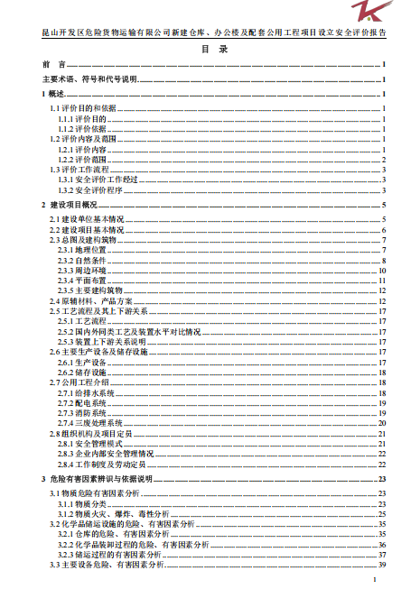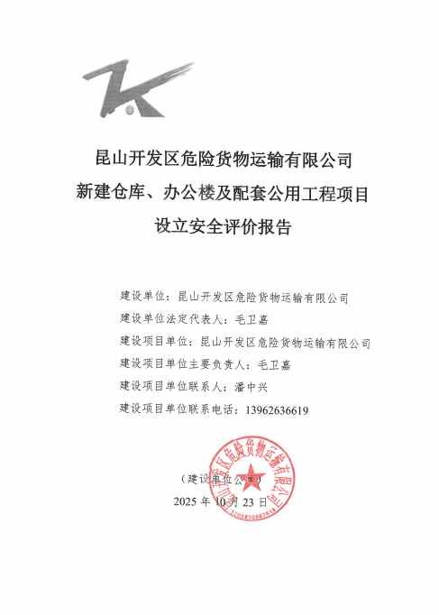 昆山開發(fā)區(qū)危險(xiǎn)貨物運(yùn)輸有限公司新建倉庫、辦公樓及配套公用工程項(xiàng)目 設(shè)立安全評(píng)價(jià)報(bào)告