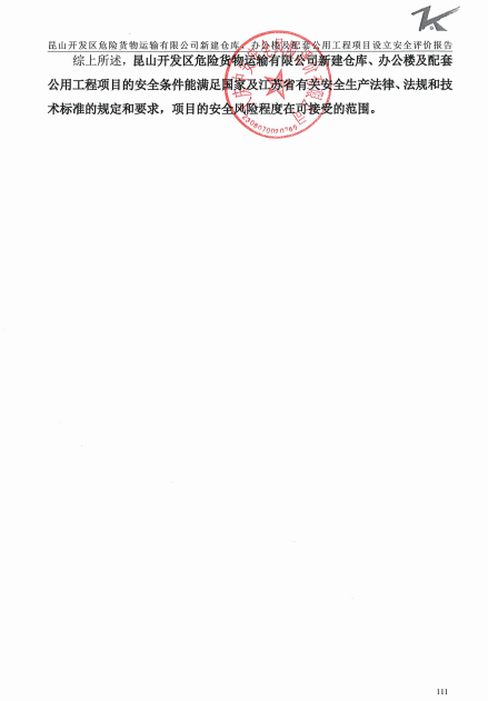 昆山開發(fā)區(qū)危險(xiǎn)貨物運(yùn)輸有限公司新建倉庫、辦公樓及配套公用工程項(xiàng)目的安全條件能滿足國家及江蘇省有關(guān)安全生產(chǎn)法律、法規(guī)和技術(shù)標(biāo)準(zhǔn)的規(guī)定和要求,項(xiàng)目的安全風(fēng)險(xiǎn)程度在可接受的范圍。 |