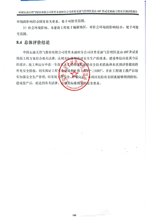 中國石油天然氣股份有限公司塔里木油田分公司澤普采油氣管理區(qū)皮山107井試采地面工程安全預(yù)評價(jià)