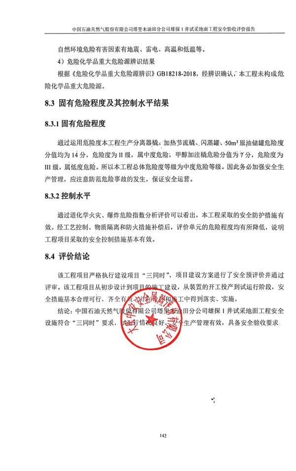 結(jié)論:中國石油天然氣股份有限公司塔里木油田分公司雄探1井試采地面工程安全設(shè)施符合“三同時”要求,試運(yùn)行情況良好,安全生產(chǎn)管理有效,具備安全驗收要求。