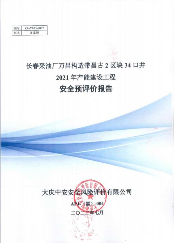 長(zhǎng)春采油廠萬(wàn)昌構(gòu)造帶昌古2區(qū)塊34口井2021年產(chǎn)能建設(shè)工程安全評(píng)價(jià)報(bào)告
