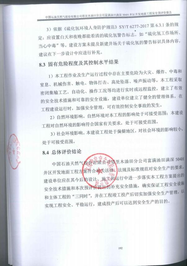 中國石油天然氣股份有限公司塔里木油田分公司富滿油田滿深504H井區(qū)開發(fā)地面工程方案符合相關(guān)法律、法規(guī)及標(biāo)準(zhǔn)規(guī)范對安全生產(chǎn)的要求。建設(shè)單位應(yīng)在其今后的設(shè)計、施工和運行中進一步落實本工程方案提出的安全技術(shù)措施和本次預(yù)評價提出的補充安全措施,確實保證工程安全設(shè)施和主體工程的“三同時”,并在工程竣工投產(chǎn)后切實加強安全生產(chǎn)管理,以實現(xiàn)工程安全、平穩(wěn)運行,建成投產(chǎn)后可以達到安全生產(chǎn)的目的。 |