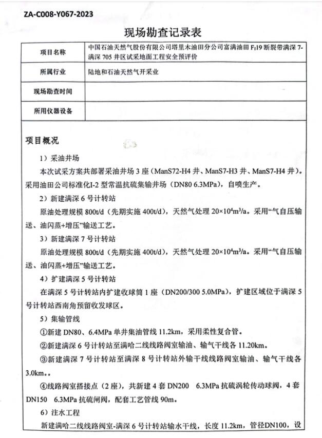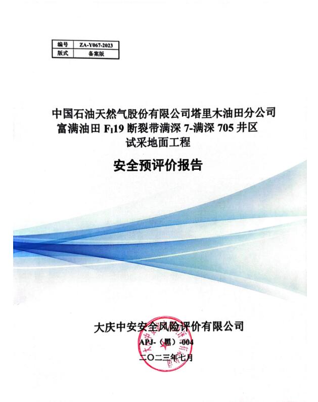 中國(guó)石油天然氣股份有限公司塔里木油田分公司富滿油田FI19斷裂帶滿深7-滿深705井區(qū)試采地面工程安全預(yù)評(píng)價(jià)