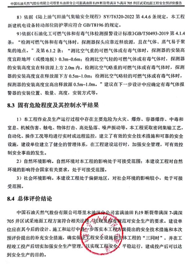 中國(guó)石油天然氣股份有限公司塔里木油田分公司富滿油田FI19斷裂帶滿深7-滿深705井區(qū)試采地面工程方案符合相關(guān)法律、法規(guī)及標(biāo)準(zhǔn)規(guī)范對(duì)安全生產(chǎn)的要求。建設(shè)單位應(yīng)在其今后的設(shè)計(jì)、施工和運(yùn)行中進(jìn)一步落實(shí)本工程方案提出的安全技術(shù)措施和本次預(yù)評(píng)價(jià)提出的補(bǔ)充安全措施,確實(shí)保證工程安全設(shè)施和主體工程的“三同時(shí)”,并在工程竣工投產(chǎn)后切實(shí)加強(qiáng)安全生產(chǎn)管理,以實(shí)現(xiàn)工程安全、平穩(wěn)運(yùn)行,建成投產(chǎn)后可以達(dá)到安全生產(chǎn)的目的。