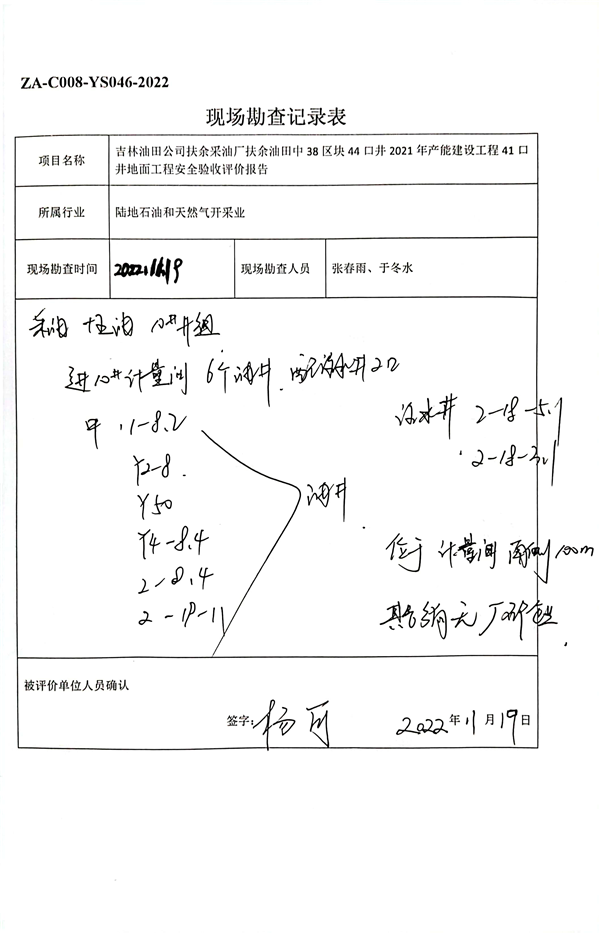 對(duì)吉林油田公司扶余采油廠扶余油田中38區(qū)塊44口井2021年產(chǎn)能建設(shè)工程41口井地面工程項(xiàng)目運(yùn)行管理和監(jiān)督制度齊全,經(jīng)現(xiàn)場(chǎng)勘察,安全設(shè)施設(shè)置情況良好,經(jīng)過符合性檢查,符合法律、法規(guī)和標(biāo)準(zhǔn)規(guī)范的要求,具備安全驗(yàn)收條件。 |