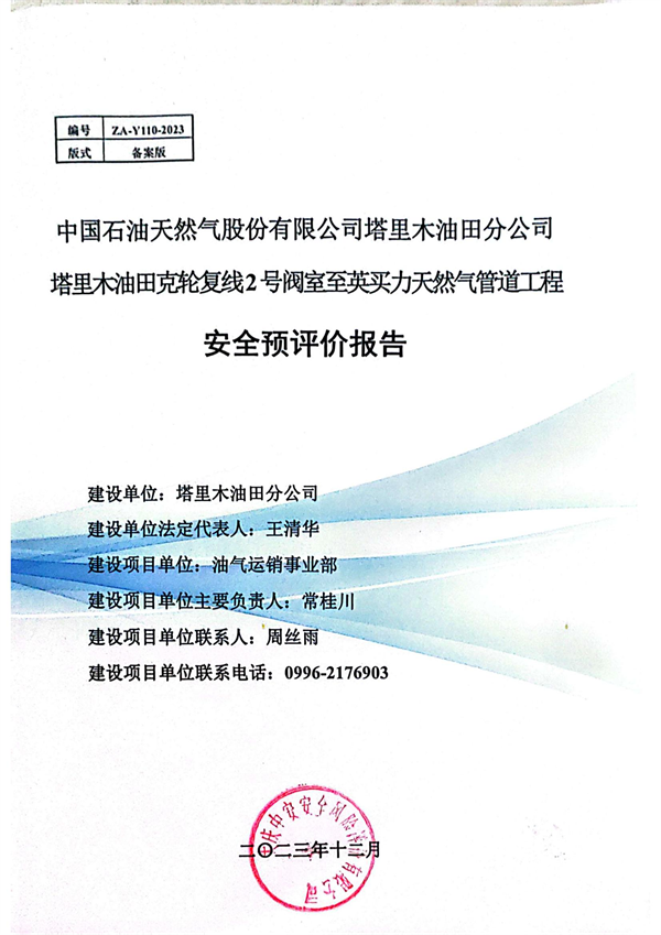 中國(guó)石油天然氣股份有限公司塔里木油田分公司 塔里木油田克輪復(fù)線2號(hào)閥室至英買(mǎi)力天然氣管道工程安全預(yù)評(píng)價(jià)報(bào)告