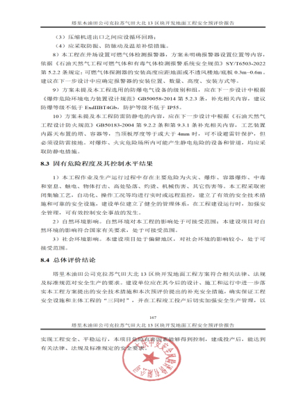 塔里木油田公司克拉蘇氣田大北13區(qū)塊開發(fā)地面工程方案符合相關法律、法規(guī)及標準規(guī)范對安全生產(chǎn)的要求。建設單位應在其今后的設計、施工和運行中進一步落實本工程方案提出的安全技術措施和本次預評價提出的補充安全措施,確實保證工程安全設施和主體工程的“三同時”,并在工程竣工投產(chǎn)后切實加強安全生產(chǎn)管理,以實現(xiàn)工程安全、平穩(wěn)運行,本項目危險有害因素能夠得到控制,建成投產(chǎn)后,能達到有關法律、法規(guī)及標準規(guī)定的安全要求。 |