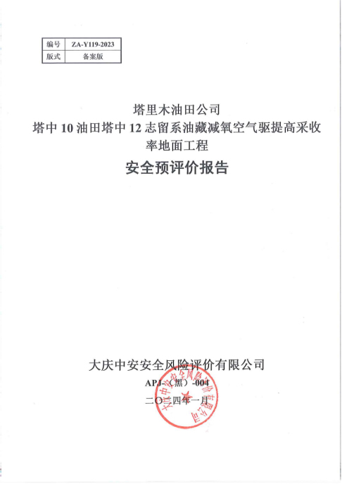 塔里木油田公司塔中10油田塔中12志留系油藏減氧空氣驅(qū)提高采收率地面工程 安全預(yù)評價