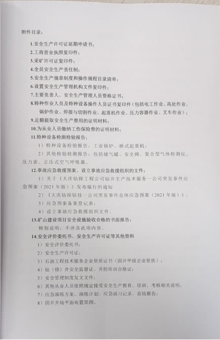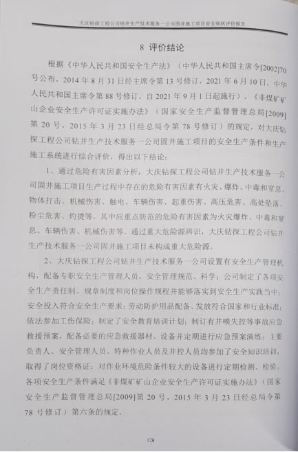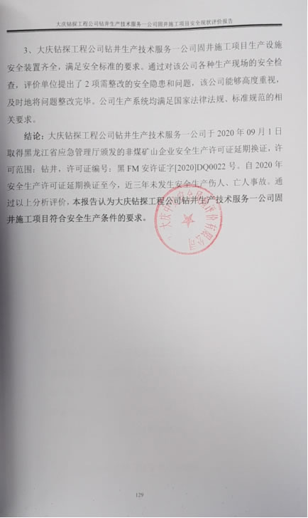 大慶鉆探工程公司鉆井生產(chǎn)技術(shù)服務(wù)一公司于2020091日取得黑龍江省應(yīng)急管理廳頒發(fā)的非煤礦山企業(yè)安全生產(chǎn)許可證延期換證,許可范圍:鉆井,許可證編號:黑FM安許證字[2020]DQ0022號。自2020年安全生產(chǎn)許可證延期換證至今,近三年未發(fā)生安全生產(chǎn)傷人、亡人事故。通過以上分析評價(jià),本報(bào)告認(rèn)為大慶鉆探工程公司鉆井生產(chǎn)技術(shù)服務(wù)一公司固井施工項(xiàng)目符合安全生產(chǎn)條件的要求。