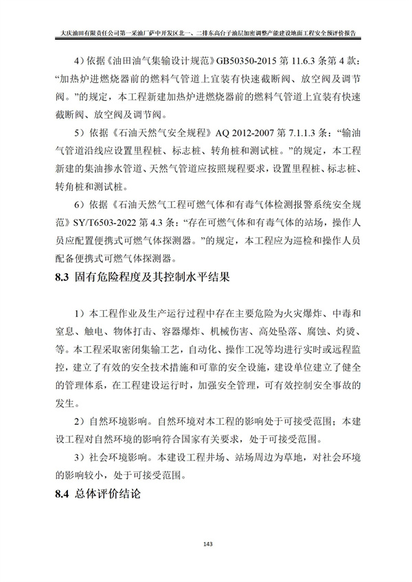 大慶油田有限責(zé)任公司第一采油廠薩中開發(fā)區(qū)北一、二排東高臺子油層加密調(diào)整產(chǎn)能建設(shè)地面工程方案符合相關(guān)法律、法規(guī)及標(biāo)準(zhǔn)規(guī)范對安全生產(chǎn)的要求。建設(shè)單位應(yīng)在其今后的設(shè)計、施工和運(yùn)行中進(jìn)一步落實本工程方案提出的安全技術(shù)措施和本次安全預(yù)評價提出的補(bǔ)充安全措施,確實保證工程安全設(shè)施和主體工程的“三同時”,并在工程竣工投產(chǎn)后切實加強(qiáng)安全生產(chǎn)管理,以實現(xiàn)工程安全、平穩(wěn)運(yùn)行,建成投產(chǎn)后可以確保安全生產(chǎn)。