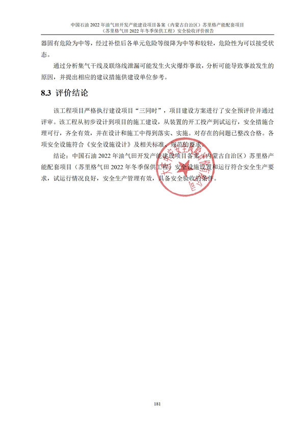 中國石油2022年油氣田開發(fā)產能建設項目備案(內蒙古自治區(qū))蘇里格產能配套項目(蘇里格氣田2022年冬季保供工程)安全設施設置和運行符合安全生產要求,試運行情況良好,安全生產管理有效,具備安全驗收的條件。 |