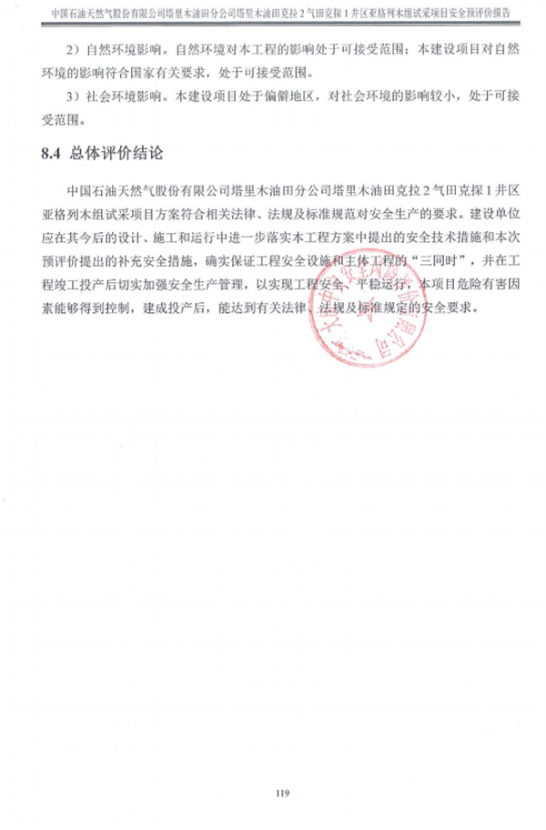 中國石油天然氣股份有限公司塔里木油田分公司塔里木油田克拉2氣田克探1井區(qū)亞格列木組試采項目方案符合相關(guān)法律、法規(guī)及標(biāo)準(zhǔn)規(guī)范對安全生產(chǎn)的要求。建設(shè)單位應(yīng)在其今后的設(shè)計、施工和運行中進一步落實本工程方案中提出的安全技術(shù)措施和本次預(yù)評價提出的補充安全措施,確實保證工程安全設(shè)施和主體工程的“三同時”,并在工程竣工投產(chǎn)后切實加強安全生產(chǎn)管理,以實現(xiàn)工程安全、平穩(wěn)運行,本項目危險有害因素能夠得到控制,建成投產(chǎn)后,能達到有關(guān)法律、法規(guī)及標(biāo)準(zhǔn)規(guī)定的安全要求。 |