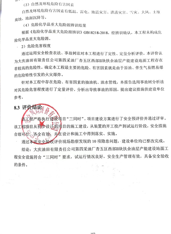 大慶油田有限責(zé)任公司第四采油廠(chǎng)杏五區(qū)西部Ⅱ塊扶余油層產(chǎn)能建設(shè)地面工程安全設(shè)施符合“三同時(shí)”要求,試運(yùn)行情況良好,安全生產(chǎn)管理有效,具備安全驗(yàn)收的條件。 |