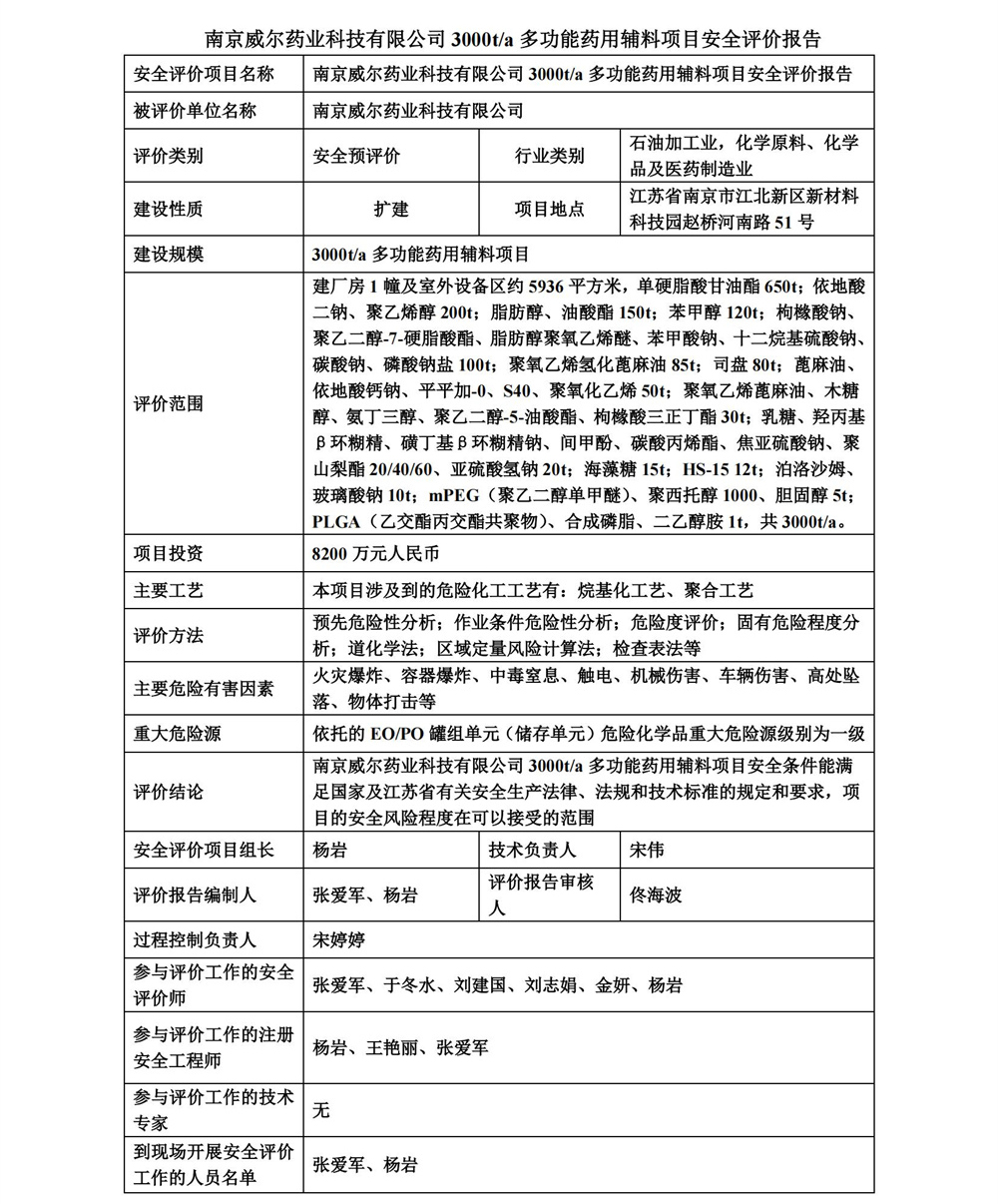 南京威爾藥業(yè)科技有限公司3000t/a多功能藥用輔料項(xiàng)目安全評(píng)價(jià)報(bào)告