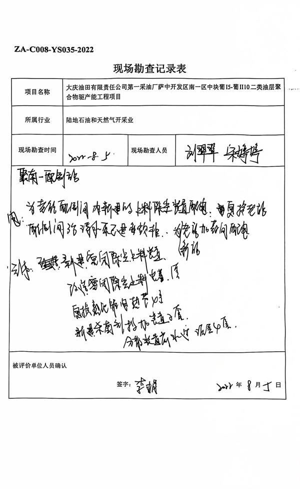大慶油田有限責(zé)任公司第一采油廠薩中開發(fā)區(qū)南一區(qū)中塊葡I5-葡II10二類油層聚合物驅(qū)產(chǎn)能工程安全驗收評價 |